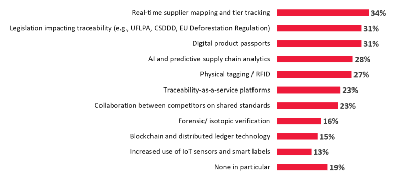 The main innovations businesses are watching are real-time supplier mapping (34%), legislation (31%) and digital product passports (31%), but while half of businesses are watching or researching innovations, only 16% are actively investing in them.